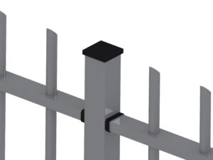 The bar fencing is constructed from bar panels that are blind-mounted to the posts, ensuring a seamless and secure connection.